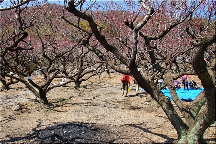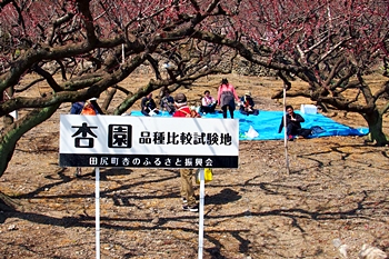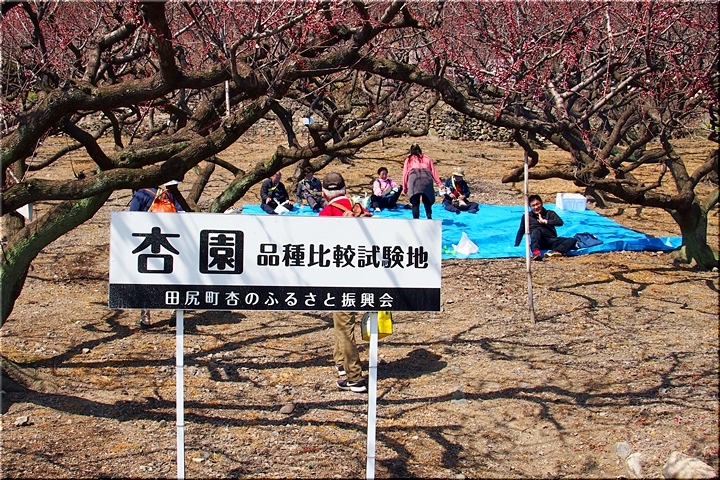 杏園(品種比較試験地)≠ワで上がって来ましたけど、残念ながら、ご覧の通り満開とは程遠い状況でありました。が、一グループの皆様がビニールシートを敷いて、蕾状態の杏を楽しんでおられます。