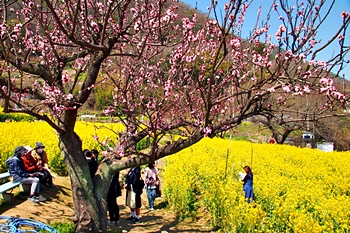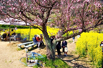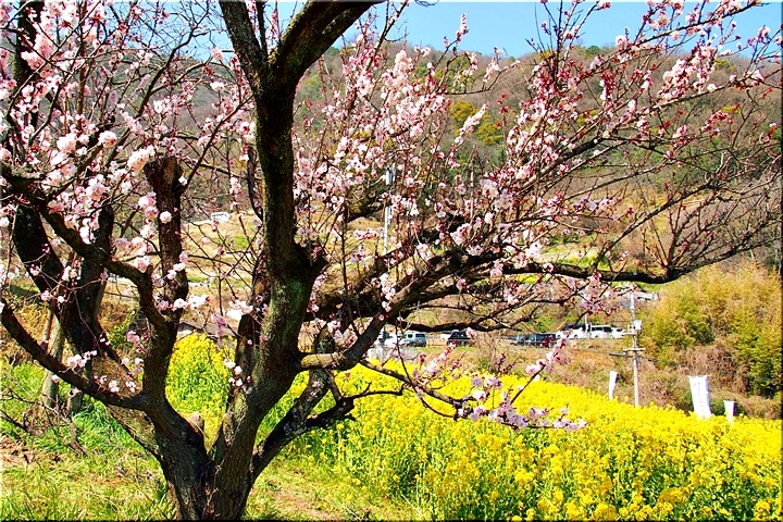 写真は、梅の花が咲き誇る十三仏周辺の様子。このあたりには、田尻なんきん畑も広がっています。なんきん畑周辺に菜の花、梅の花が咲き誇り見事なハーモニーを醸し出しています。梅が終わると杏のが彩を加えて、一層可愛さを増すのです。