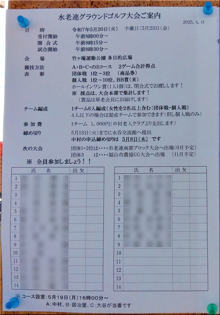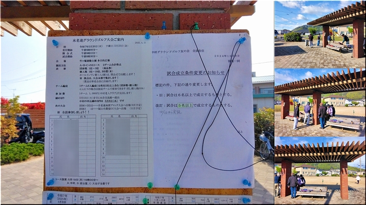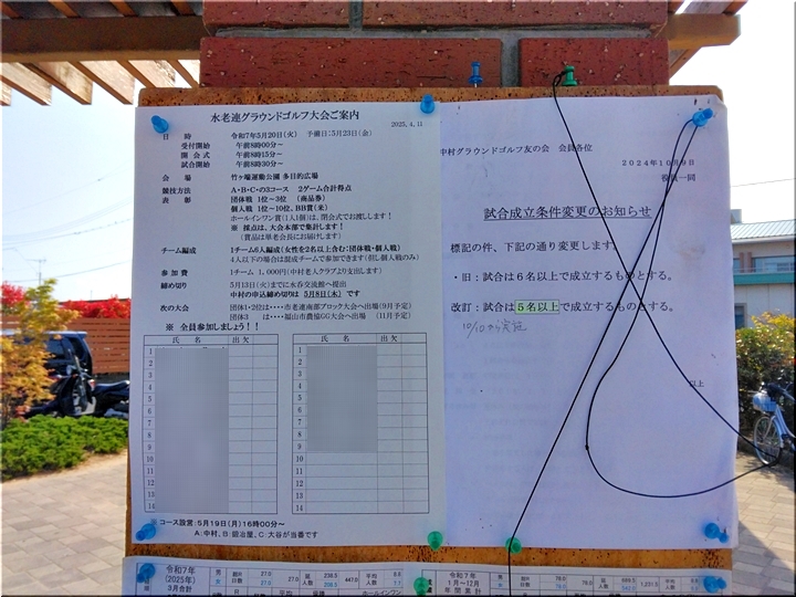 プレー開始までの待ち時間を利用しまして掲示板に眼を向けますと、5/20(火)・水老連GG大会∞6/5(木)・水呑学区自治会対抗GG大会≠フご案内の掲示が…