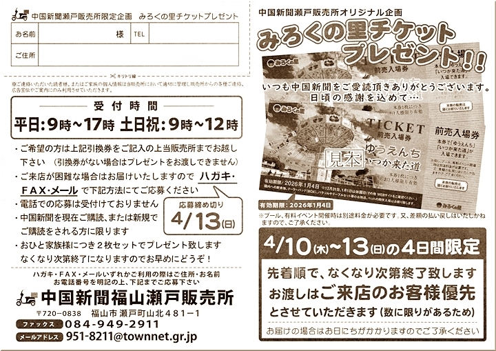 一週間ばかり前でしたか…中国新聞朝刊の折り込みチラシの中に、こんなみろくの里チケットプレゼント!!≠フ案内が入っておりました。