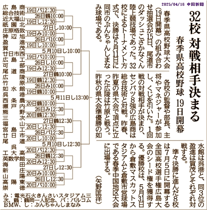 昨日の新聞記事によりますと、春季広島県高校野球大会≠ェ、4/19(土)に開幕のようですねぇ〜
