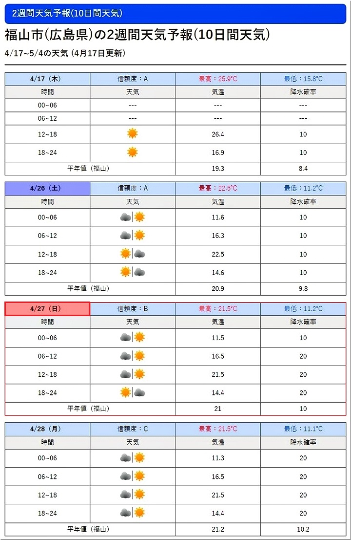 でも、気になりますのが空模様。福山市の2週間天気予報を見てみますと、どぅやら降雨の心配はなさそうですネ(^-^)//"