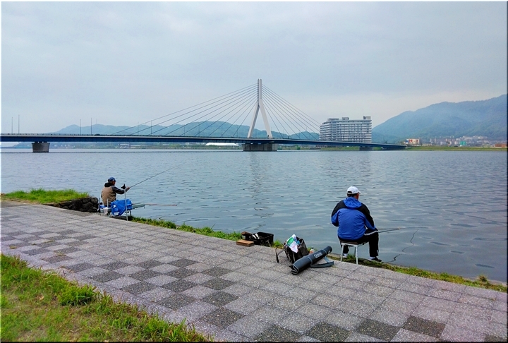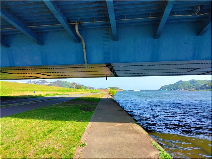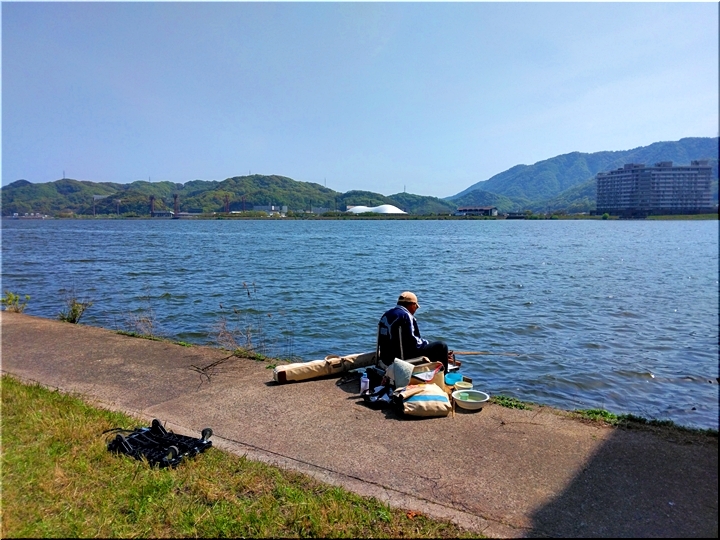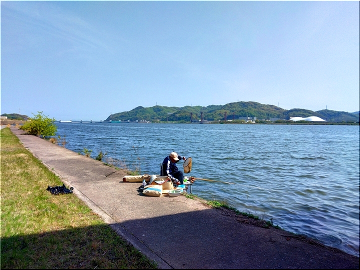 心地良い向かい風を受けながら芦田川大橋に向かいますと、橋の下近くに釣り人がお一人。