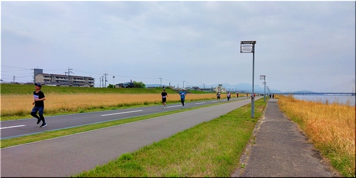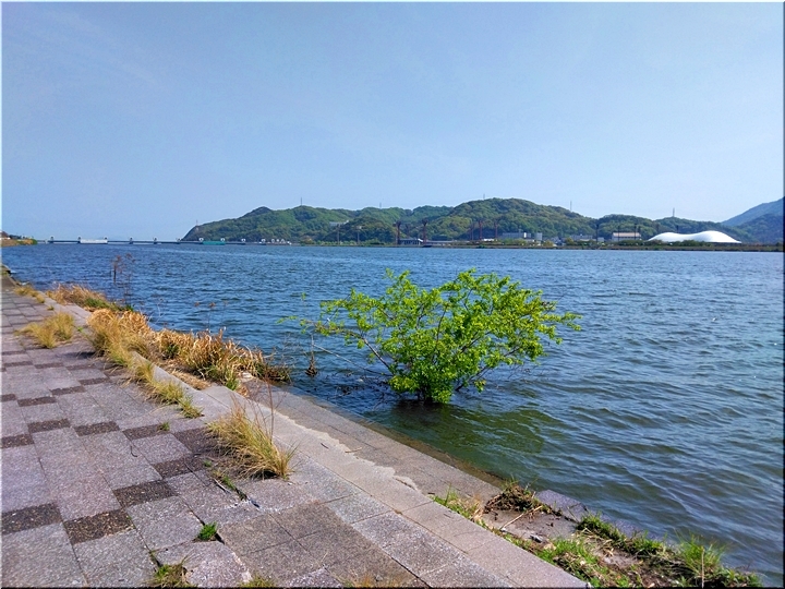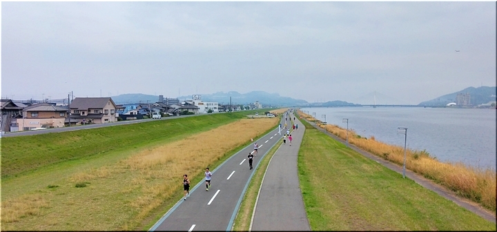 川下から川上方向へ結構、強い南風が吹いておりまして、実に爽快。心地良い、気持ち良い風でありました。でも、小水呑橋・芦田川大橋上では、帽子が吹き飛ばされそうで、時たま帽子を押さえながらの、うつむき加減の姿勢を強いられましたけど(^-^)