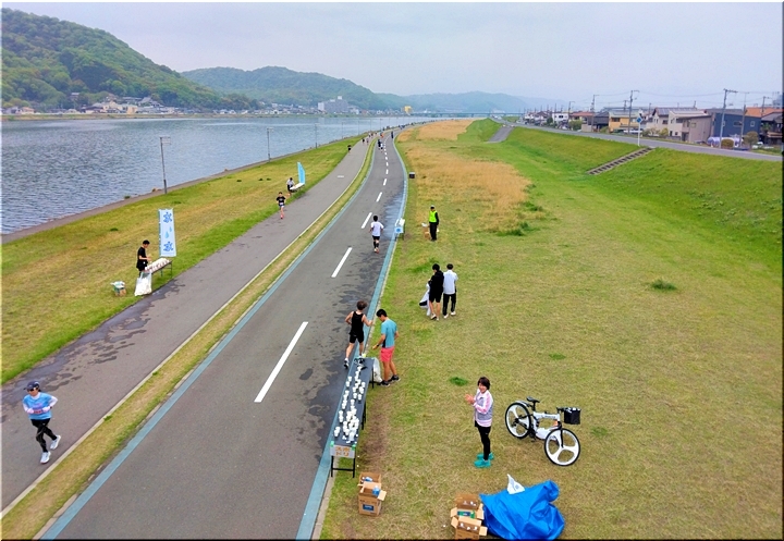 芦田川左岸の小水呑橋〜芦田川大橋間の河川敷では、11名のグループの皆様が集合写真を撮っておられます。イスの上にカメラをセットし…