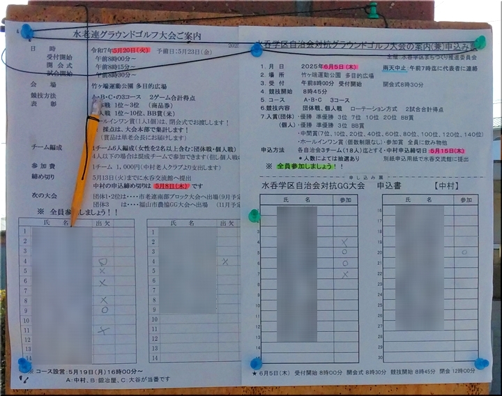 水老連GG大会≠フ方は火曜日の開催で、GONsanは掲示と同時に○印を記入しておりましたけど、水呑学区自治会対抗GG大会≠フ方は、後から追加掲示されたようですネ。これは木曜日の開催ですから×印を記入のGONsanです。