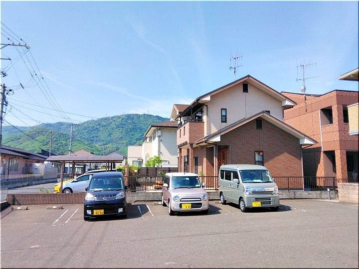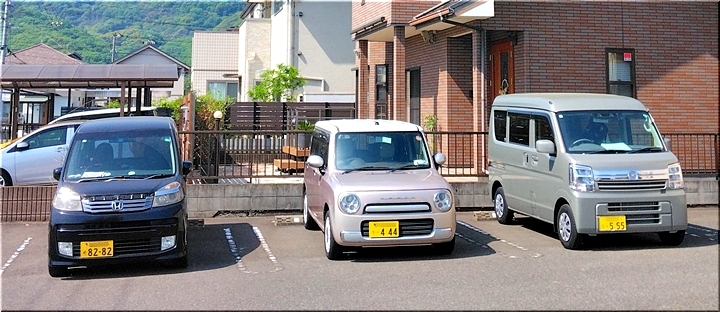 この駐車場、いつもは他にも車が駐まっているのですけど、大型連休に突入で出掛けておられますのか、奇しくも駐車場に存在しますのは、この3台のみで、ナンバーが3台とも印象に残りますから笑ってしまいます(^-^)