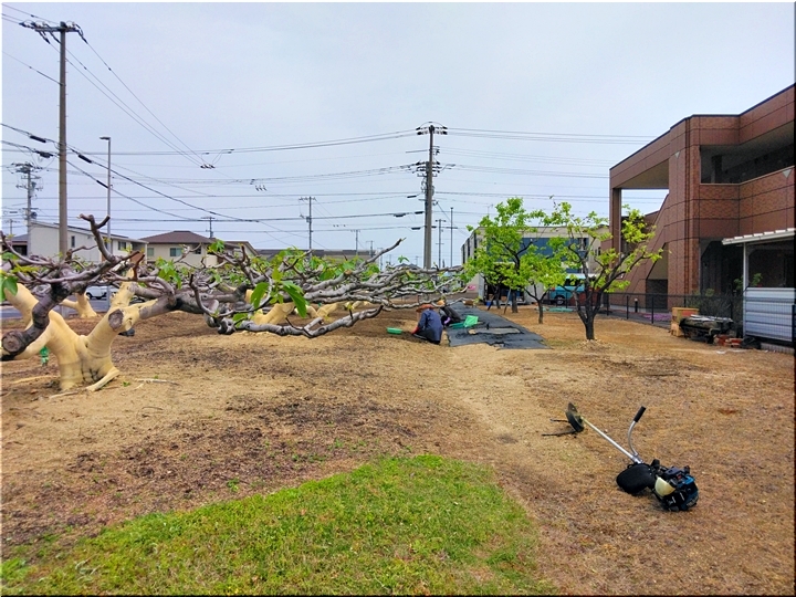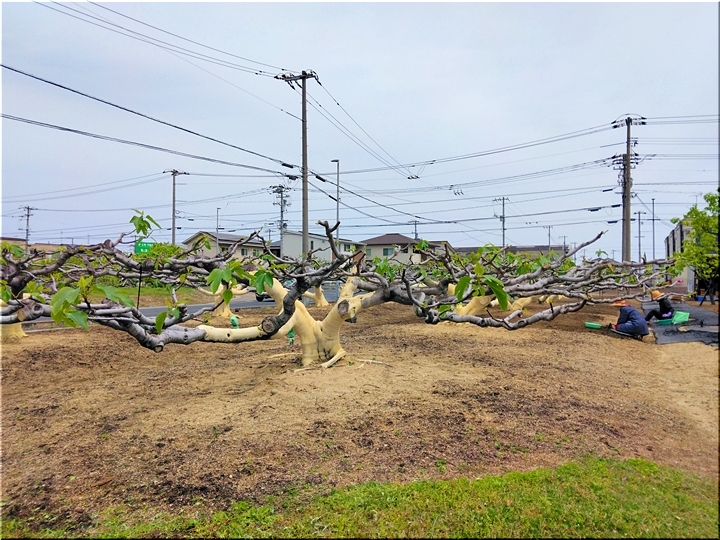 いつもご夫婦で、このイチジク畑のお世話をしておられます。この日は草取りを…立派なイチジクの木々の白っぽくなっています部分は、何か分かりませんけど薬剤を樹幹散布済み。