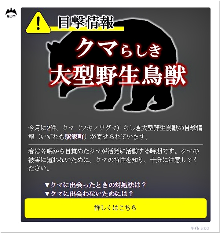 4月に入り、クマ(ツキノワグマ)らしき大型野生鳥獣の目撃情報が2件(いずれも駅家町)寄せられています。