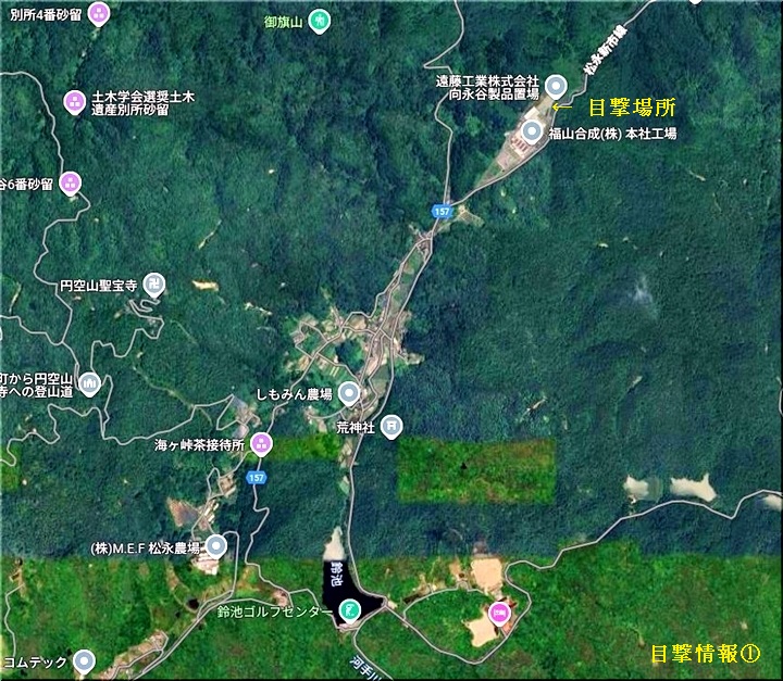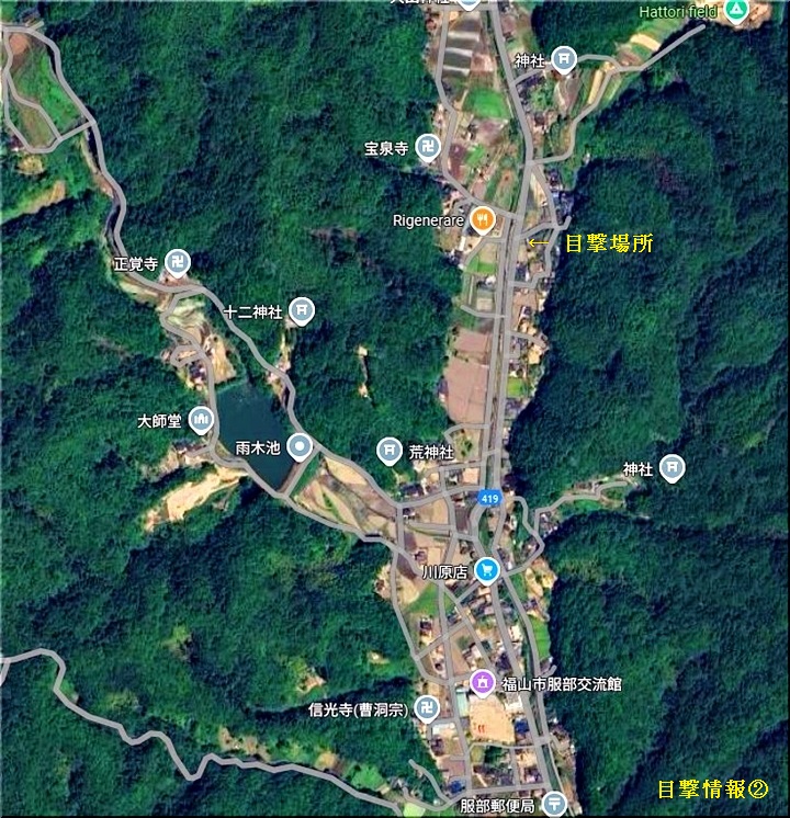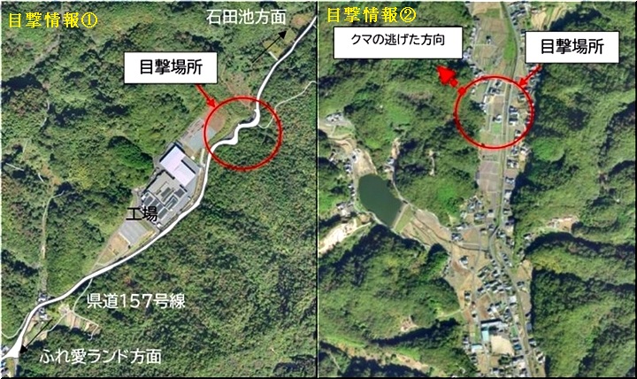 状 況 目撃者が、自動車で県道157号線を北側(駅家方面)に向けて走行中、子グマらしき野生鳥獣が東側の山へ走っていく後姿を見た。