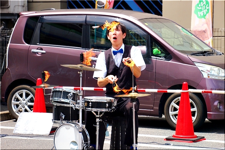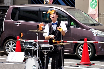 スティックをジャグリングで回しながら曲に合わせてドラムを叩くパフォーマー。LEDを使ったり、様々なジャグリング技術を使い飽きさせない技を披露する。