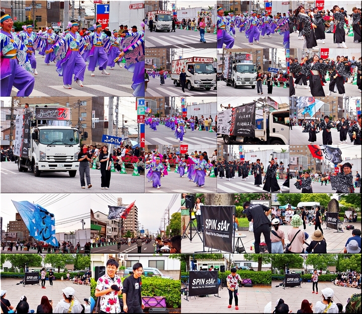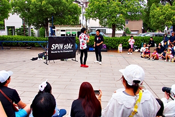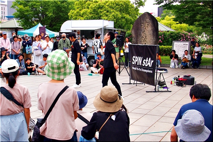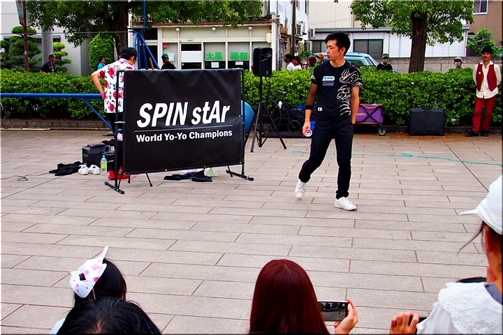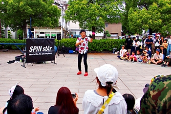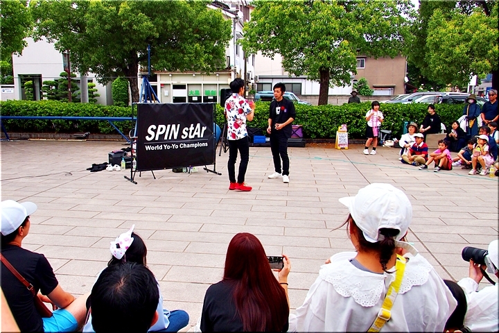 ローズパレードが終わりますと、また道三川沿いをノンビリと歩き中央公園にと戻ります。中央公園南口に戻って来ますと、ここではSPIN stAr≠フお二人のパフォーマンスを囲み人の輪が(^.-)☆