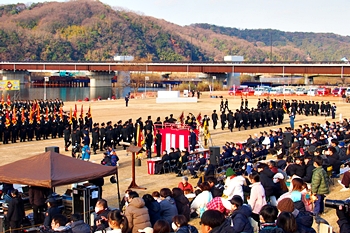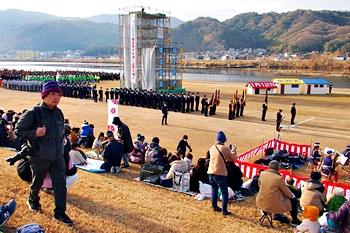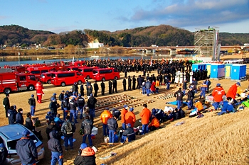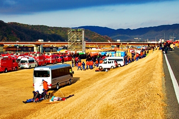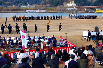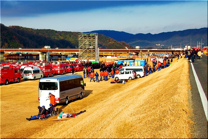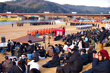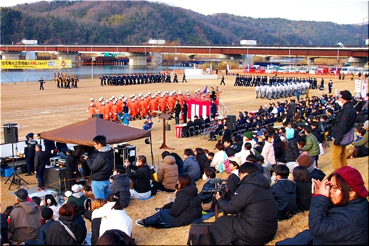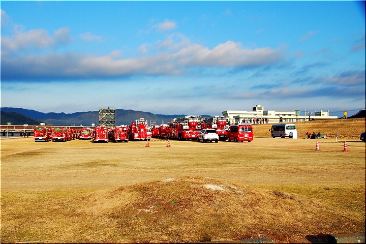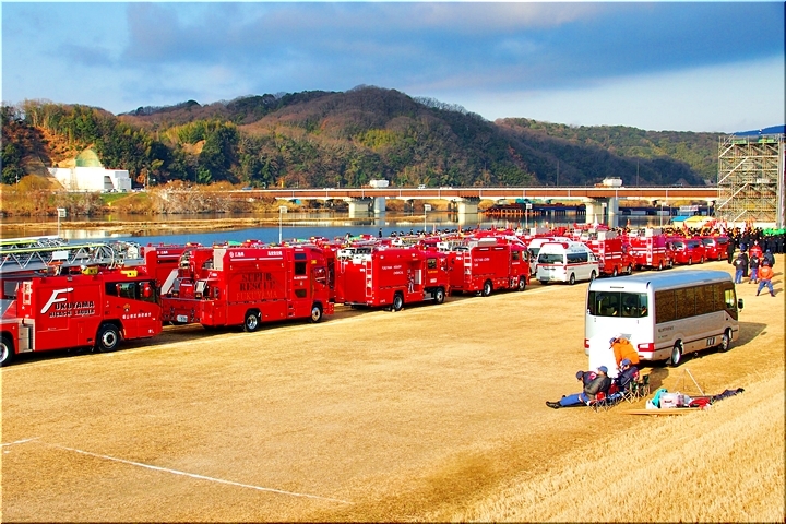出初め式は、9:00スタートで、徒歩部隊・車輌部隊の分列行進∞式典∞演技披露∞公開訓練=cと続いて行きますけど、会場に到着しますと未だ観客もさほど多くはありません。その内に演技披露∞公開訓練≠ェスタートします頃には、大勢の方々がヤッて来られるものと思います。