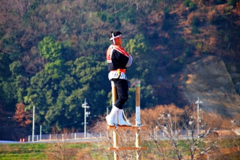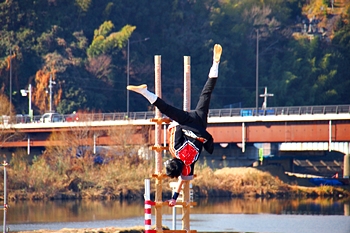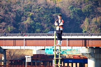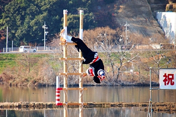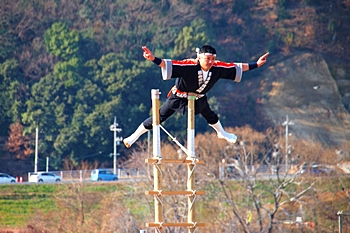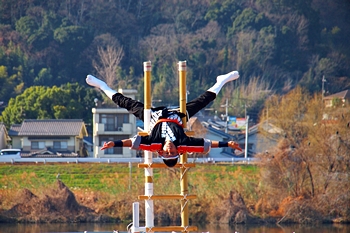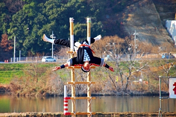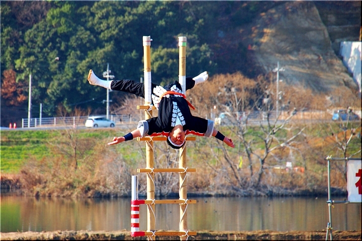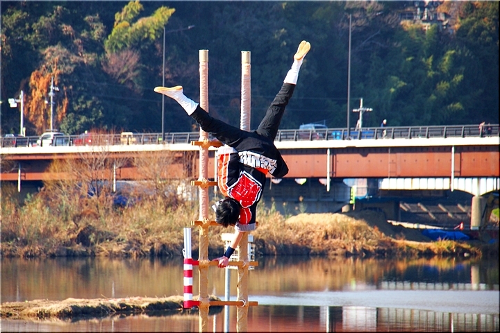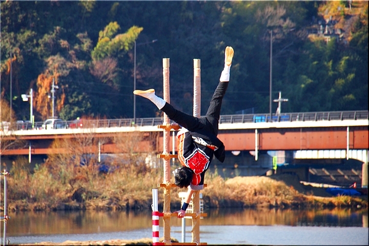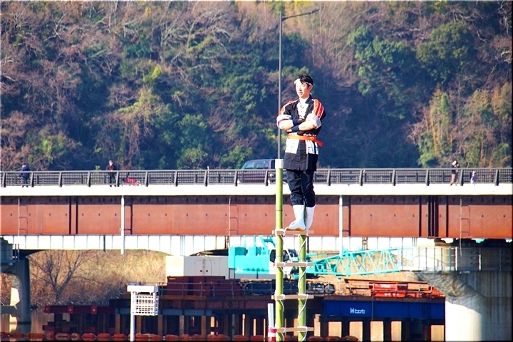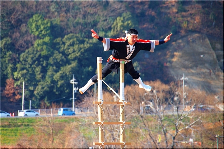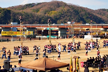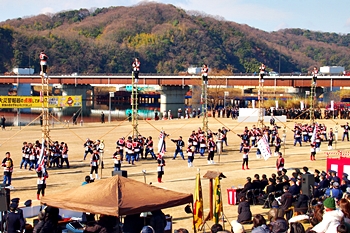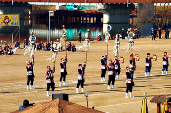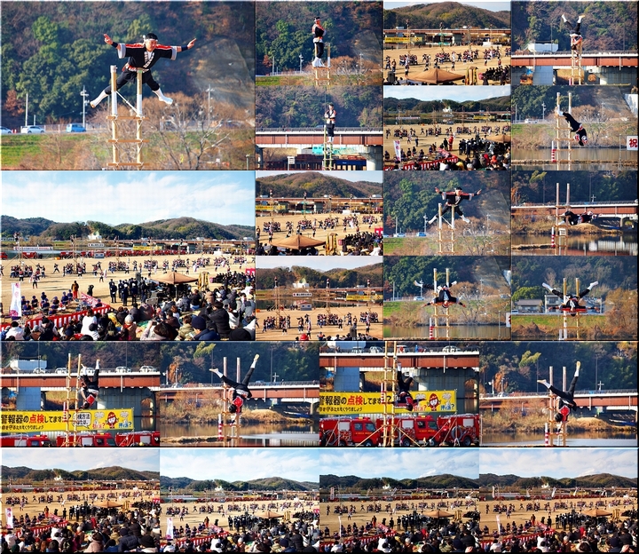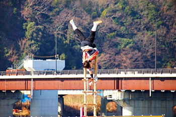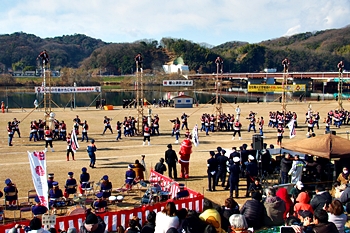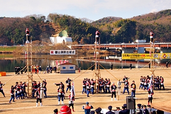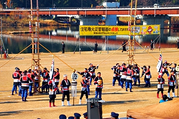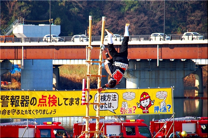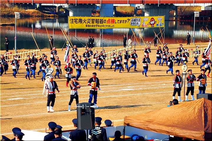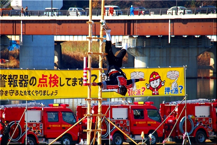 光学区少年少女消防クラブ≠フマーチングが終わりますと、木遣(はしご乗り)≠フ皆さんが登場です。こぅして見ますとハシゴの高さはさほどでもないようですけど、初めてハシゴのてっぺんに立ちますと、あまりの高さと恐怖で足が震えるみたいですネ(^-^)//"