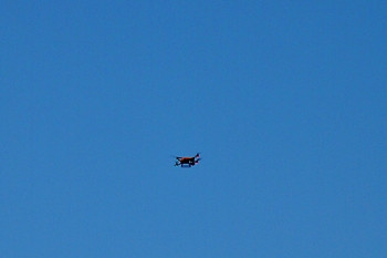 化学消防車の消火活動中には、上空からドローンで情報収集も併用ですネ。