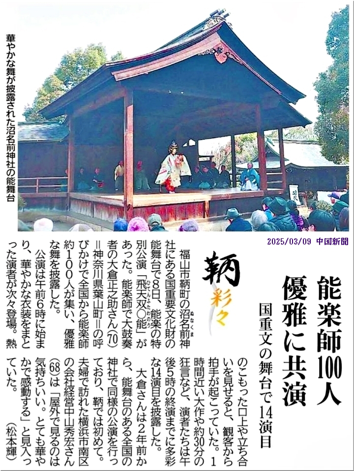 翌日の中国新聞朝刊紙上には、こんな記事で能舞台の様子を(^-^)/