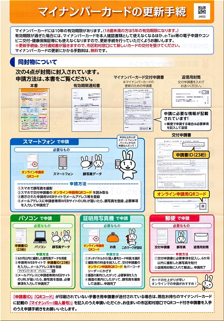 既に手続きは終えましたけど、せっかくですから開封して、届きました書類を確認してみますと、ふ〜ん、市役所に出掛けなくても、色んな方法でカード更新手続きは行えるようですねぇ〜