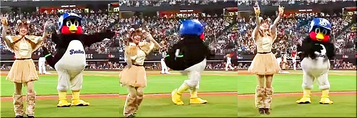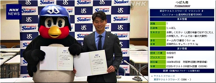 つば九郎は1994年4月9日に神宮球場でデビュー。愛くるしい見た目とは裏腹に舌鋒(ぜっぽう)鋭く世相や野球界を斬るフリップ芸で屈指の人気マスコットに。五回終了後に行われるヘルメットを空中で回転させてかぶることに挑戦する「空中くるりんぱ」も人気となったが、これまで成功はなかった。毎年の契約公開も反響を呼び、今季は1月28日に年俸6万円プラスヤクルト1000の飲み放題でサインしていた。その人気は球団の枠を超えて、日本プロ野球界でナンバー1といえるマスコットに。他球団の選手との交流や現役時代3度の3冠王に輝いた落合博満氏とのほっこりするやりとりなども話題となった。