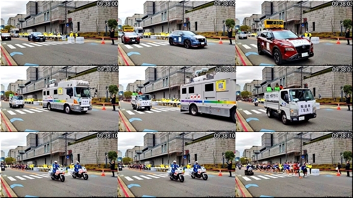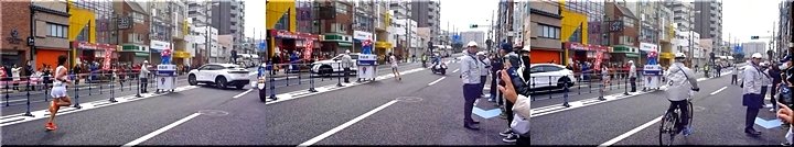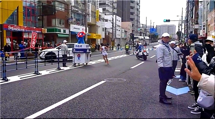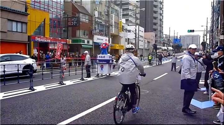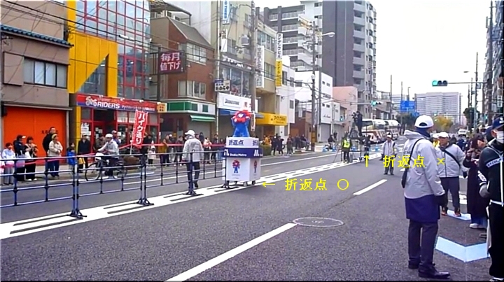 複数の折り返し地点があるコース。地点には万博のマスコット、ミャクミャクの像が置かれていた。1台の白バイ、タイム表示の関係車は予定通り折り返していたが、もう1台の白バイと報道の中継カメラが直進。これについていってしまった形となった。20メートル先の折り返し地点を撮るために設置されていたカメラ台の先を折り返す形となり、中継では約11秒のロスとされた。