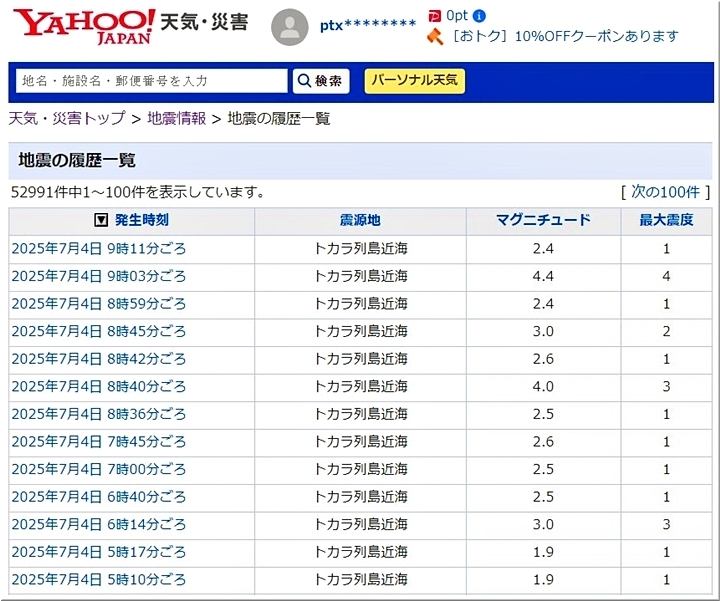 喫煙を終え家の中に入りテレビを前にしますと、画面上部にトカラ列島近海を震源とする地震情報のテロップが…