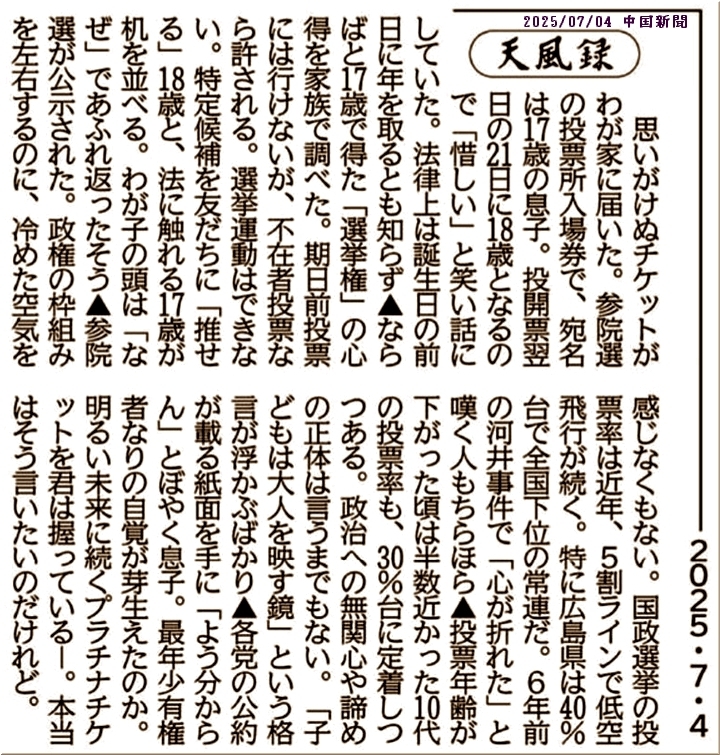 昨朝、中国新聞朝刊に眼を通しまして、まず眼に止まりましたのが天風録=B