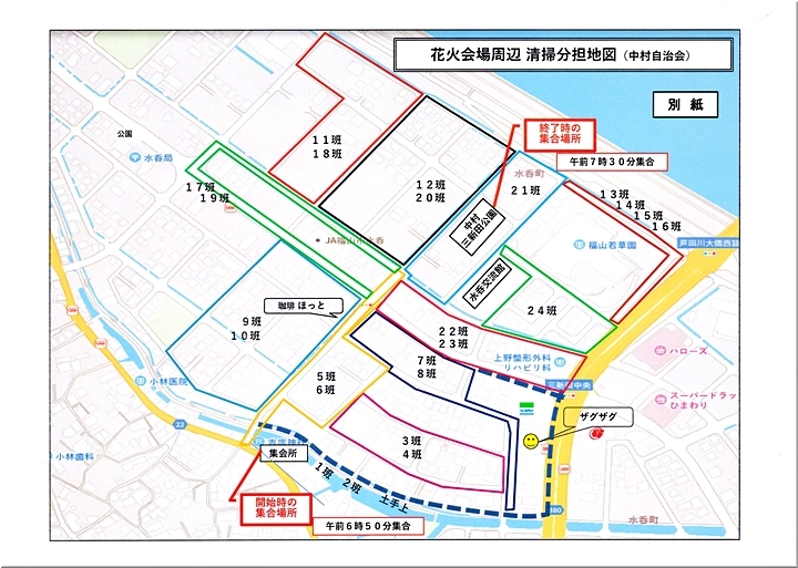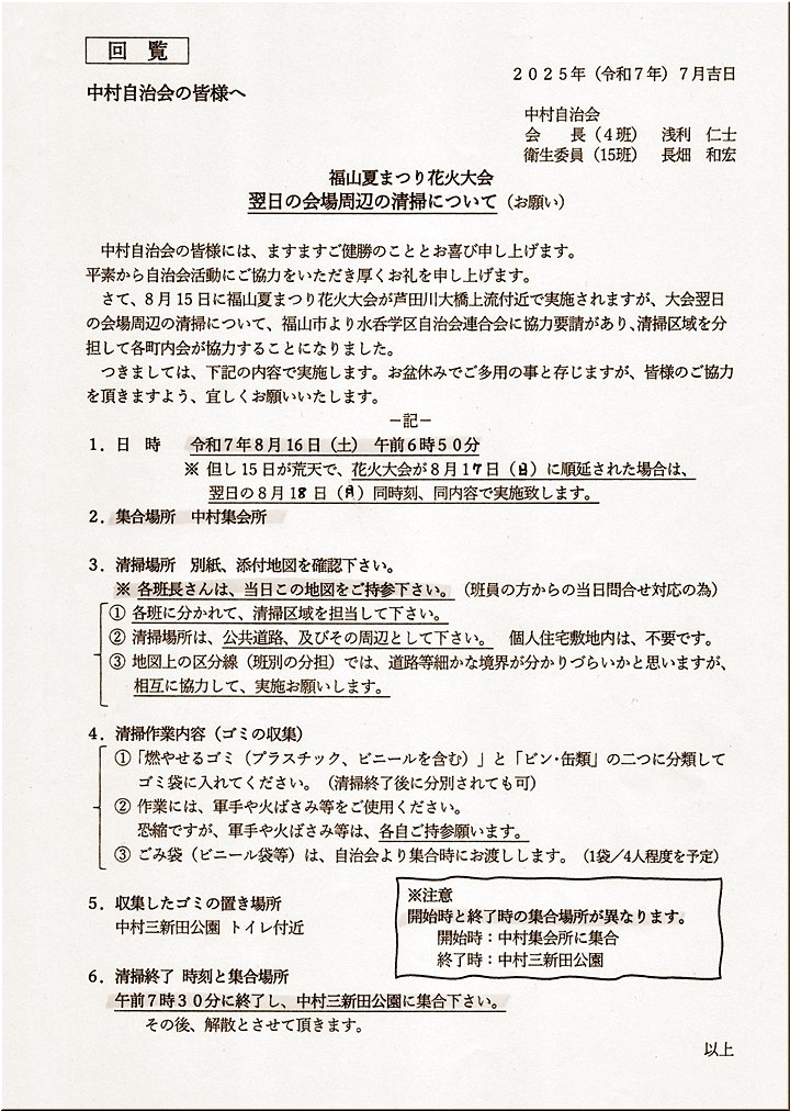 まず、芦田川花火大会翌日の会場周辺の清掃のご案内。