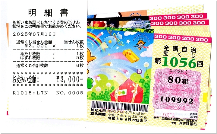 ロト6∞ロト7≠フハズレ券は、整理しませんとスグにたまりますからサッサと破棄するのですけど、その際に、この当選宝くじを一緒に破棄しておりませんで、本当に『ドキッ』でありました。