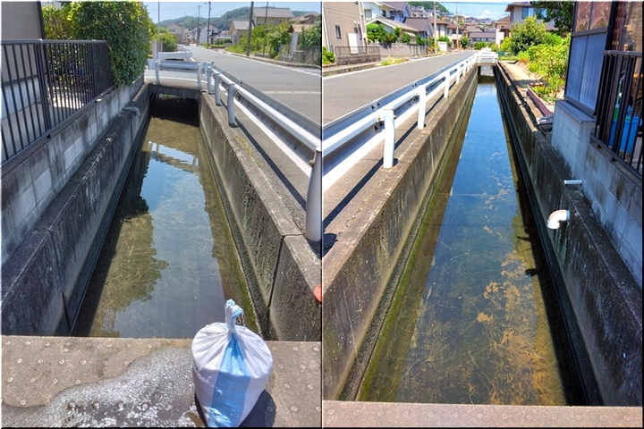 昨朝の、A.M.9:00頃でしたか…我が家前で一服しながら「今日も、日中は随分気温が上昇するんだろうなぁ〜」と、周辺の景観を見廻しておりまして、何気なく我が家横を流れます用水路を覗きますと、水面が波打っておりました。