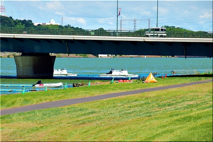 芦田川大橋下を通過し小水呑橋下へと向かっておりますと、8/2〜8/4の3日間で実施されますローイング種目の出場選手の方達なんでしょうネ。既に設営済みのコースで4人の選手がコーチの指導のもと練習中。漕ぎ手がお一人ですからシングルスカル≠フ選手の皆さんのようであります。