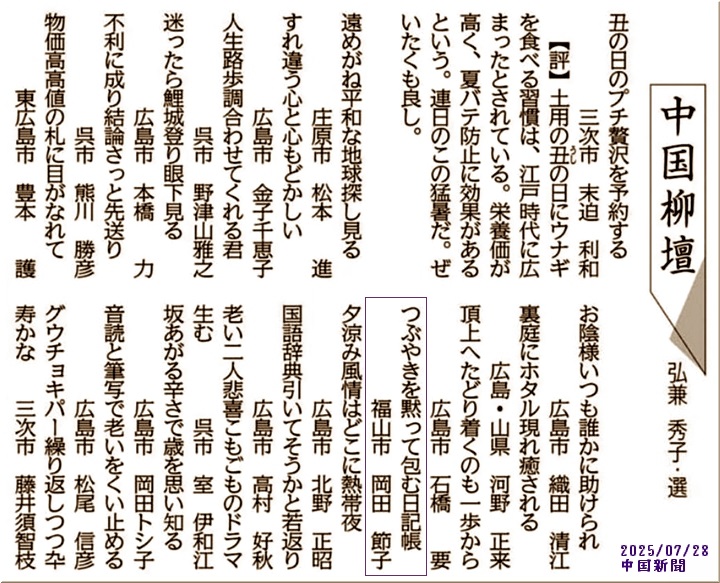 昨日、中国新聞朝刊に眼を通しておりますと、文芸コーナーに従姉のお名前が…連日の猛暑にも負けず、元気に変わりなくお過ごしのようで、まずは一安心。