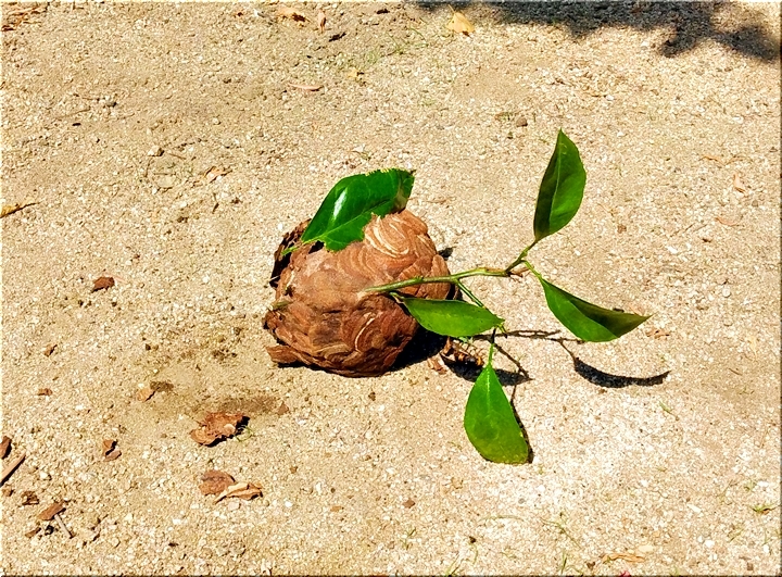 巣の廻りにはスズメバチもいなくなりましたけど、念のため、再度、巣の穴にタップリとジェット噴射。もぅハチも出て来ませんし大丈夫のようでしたから、蜂の巣は剪定ばさみで枝から切り離しです。