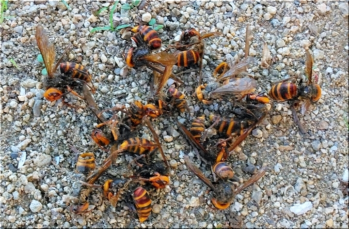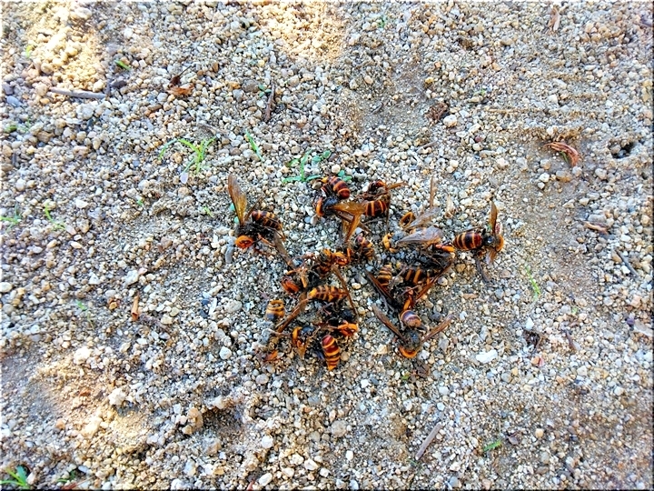 数時間後、ミカンの木の下を確認してみますと、13匹ばかりの死骸が転がっておりました。ジェット噴射で飛び去ったのかと思いましたら、噴射されましたハチは即死でしたのかも…