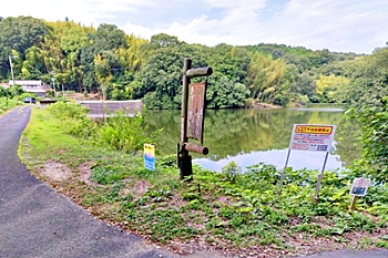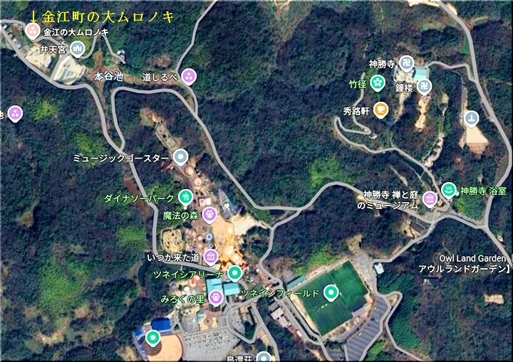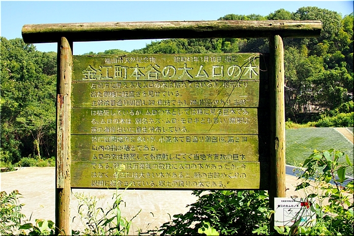 県道72号線(福山沼隈線)を洗谷≠ゥら中山南&向に走行し、みろくの里入口≠右折しみろくの里≠通り抜けますと、この「金江の大ムロの木」の説明板の場所に到着です。