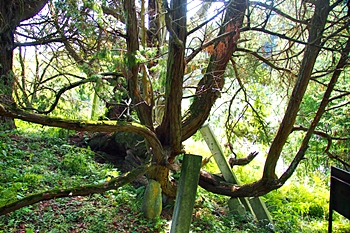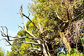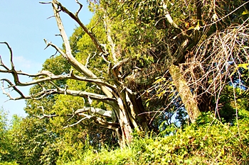主幹の目通り周囲4.5m、側枝でも目通り周囲は1.7m、樹高約8m。主幹は枯れていますが、根本より出た側枝が旺盛な樹勢をみせています。