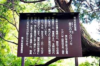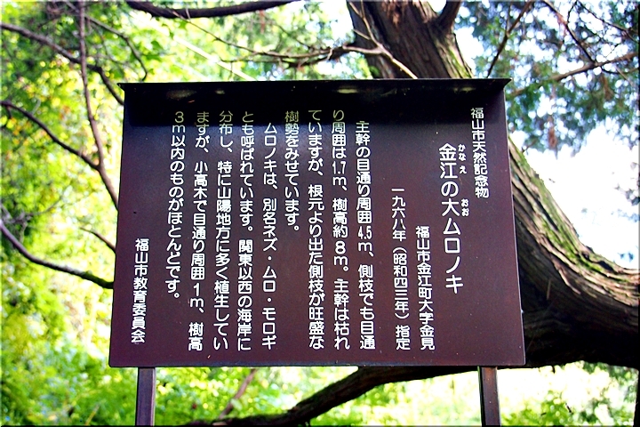 ムロの木は枯死しても腐敗しにくく当地方有数の巨木である。鞆には万葉集の歌枕にムロの木があったが、今はなく、金江には大きい木があると、鞆の古跡巡りの説明に紹介されている。郷土の誇りの木である。