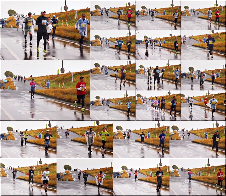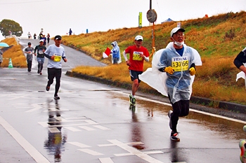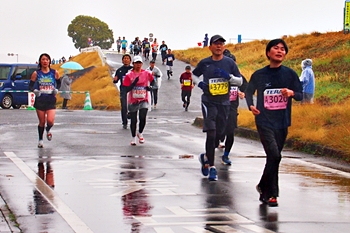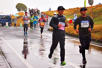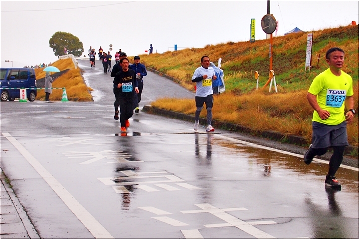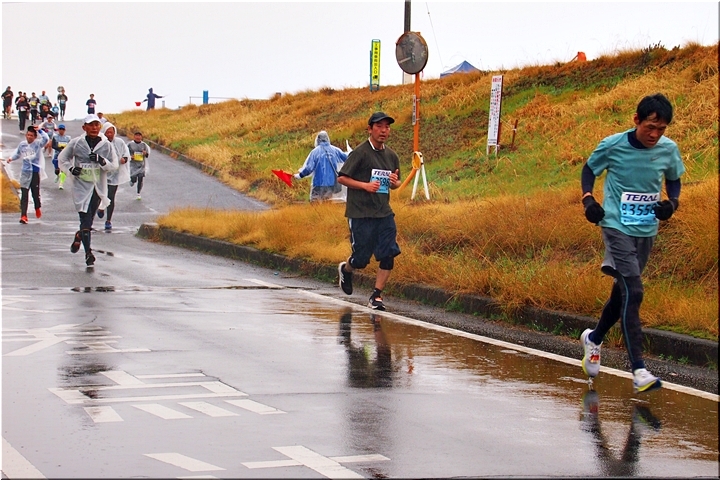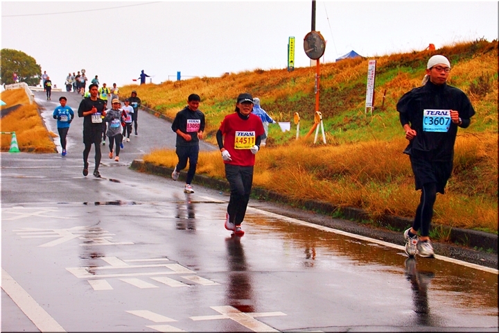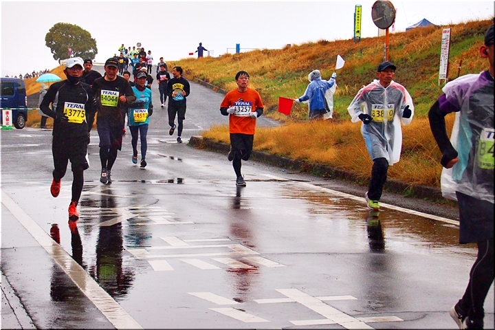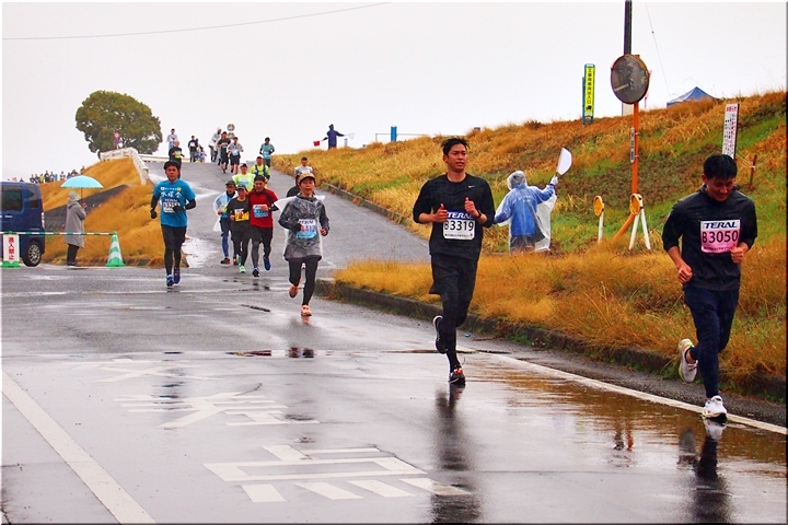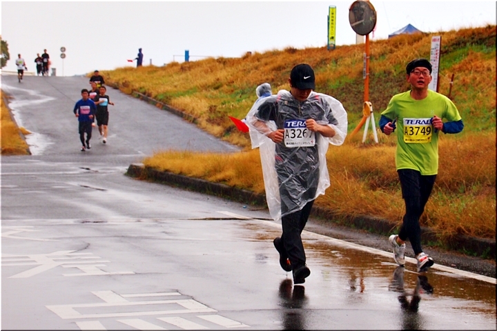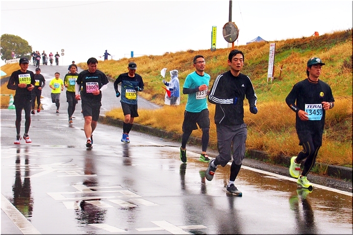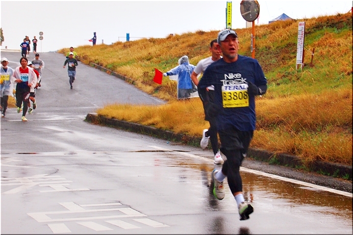 決して速いとは言えませんけど、10km所要時間54分≠ネら、ジョギングとしましては良いペースですネ。降雨という悪天候でもありますし、お顔の表情には余裕がお有りのようですから、10kmマラソンを楽しく走っておられると言う事なんでしょうネ(^.-)☆