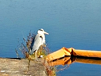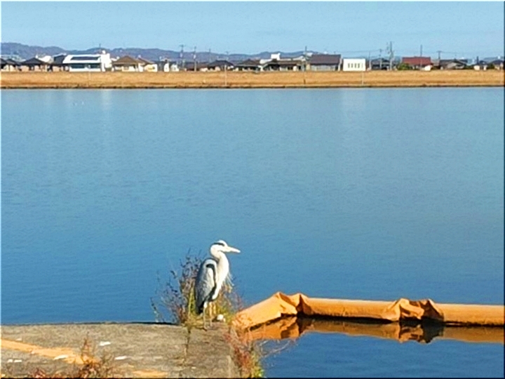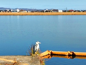 右手の護岸側に眼を向けますと、アオサギ君が何を見るでもなくボンヤリと佇んでいます。陽気な気持ち良さに居眠りでもしていますのかも…