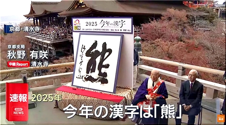 ◆【速報】2025年今年の漢字は…「熊」京都・清水寺で発表 全国各地でクマによる被害・目撃情報相次ぐ 和歌山・白浜のパンダ(熊猫)も 2位は「米」3位は「高」