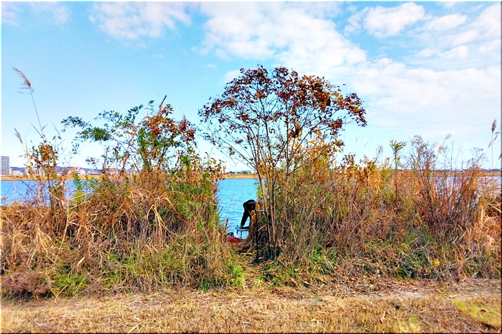 この6人の釣り人の中で、一番川下に位置される方。往路では、剪定ばさみを手に護岸際の草木を切除しておられました。復路で眼を向けますと、人が一人通れます程度の幅で草木は切除済み(^-^)