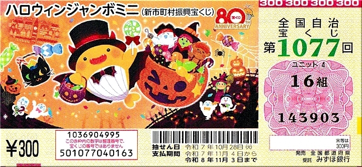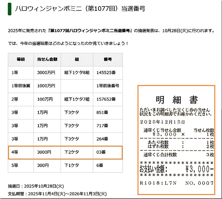 年末ジャンボ購入代金精算のためサイフの中をゴソゴソしておりますと、ハロウィンジャンボ・ジャンボミニ・ロト6・ロト7…等の抽選日経過分が数枚ばかり(^-^)