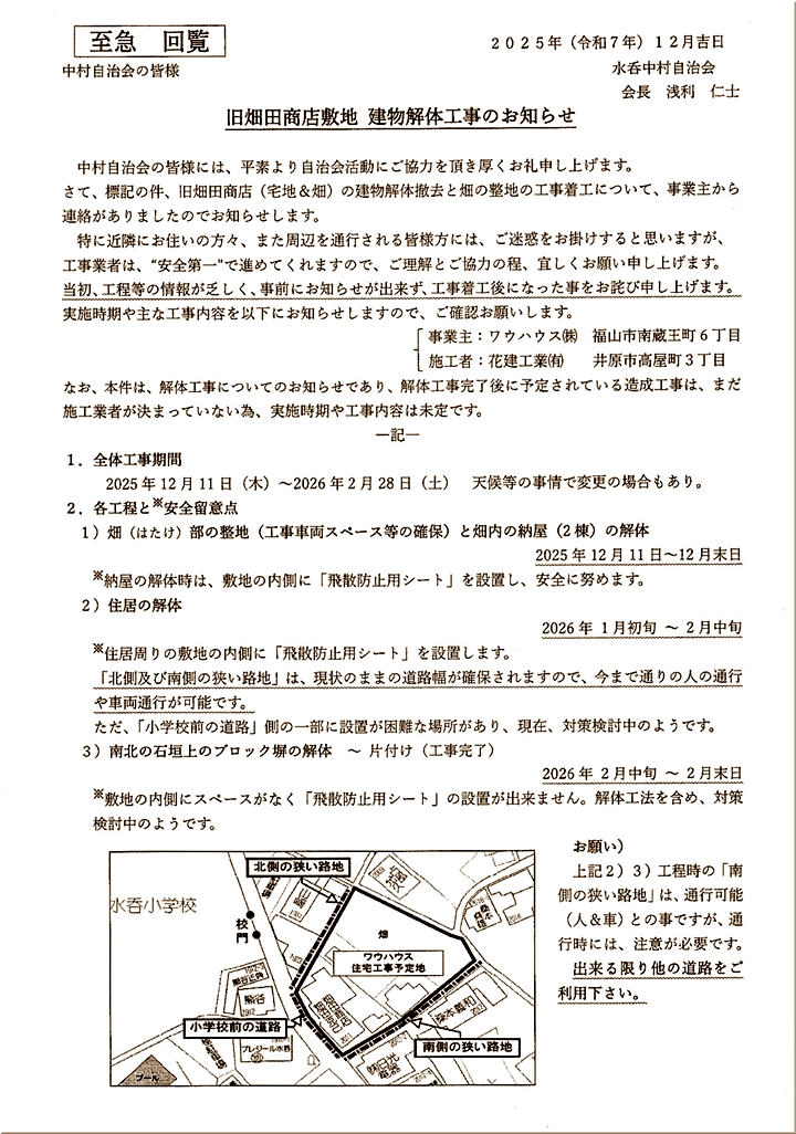 まず、「旧畑田商店敷地 建物解体工事のお知らせ」ですけど、ふん、ふん、建物の解体ですか…この建物の裏と言うか東側には畑がありますけど、建物の解体で、畑と一緒に宅地造成。そして、賃貸住宅でも建設されますのかも…