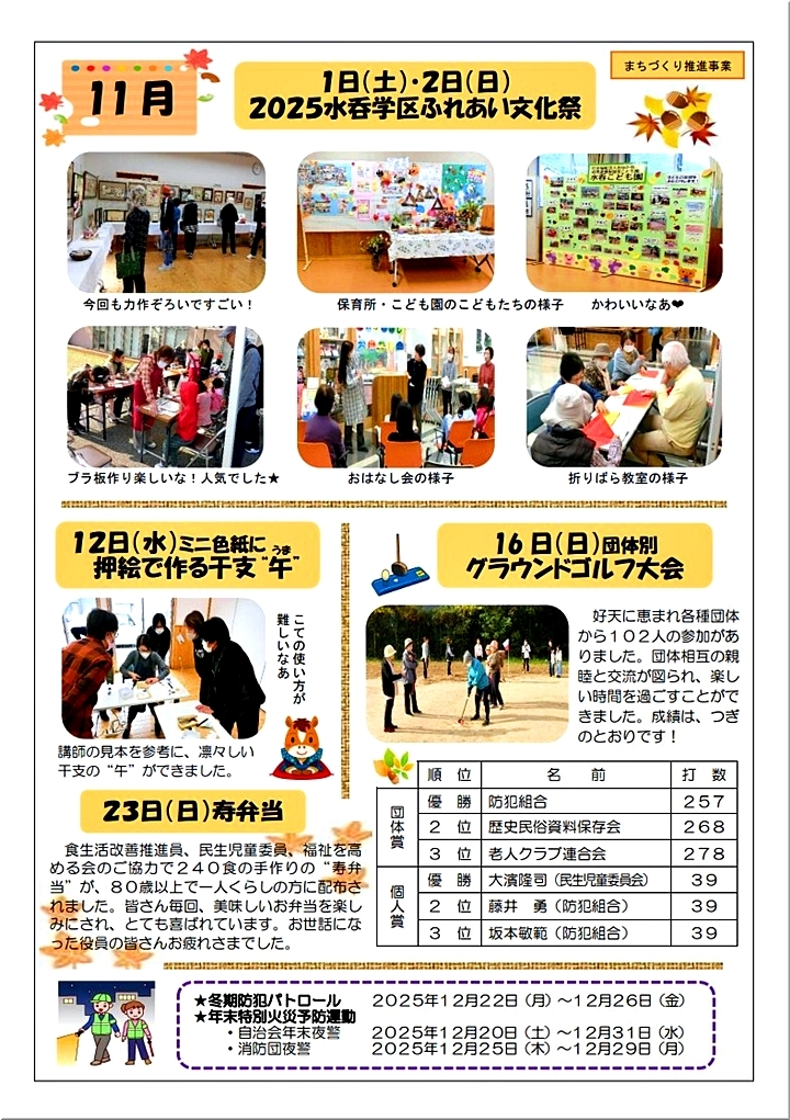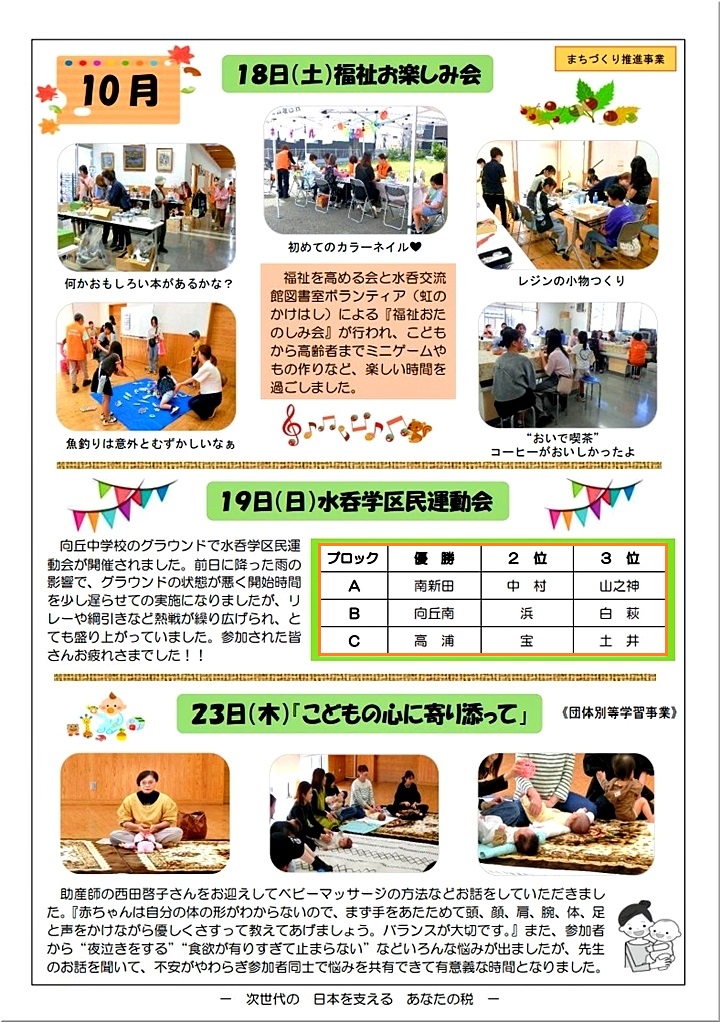 水呑交流館だより≠確認してみますと、そぅそぅ、10/19(日)開催の水呑学区民運動会≠フ成績の掲載が(^-^)