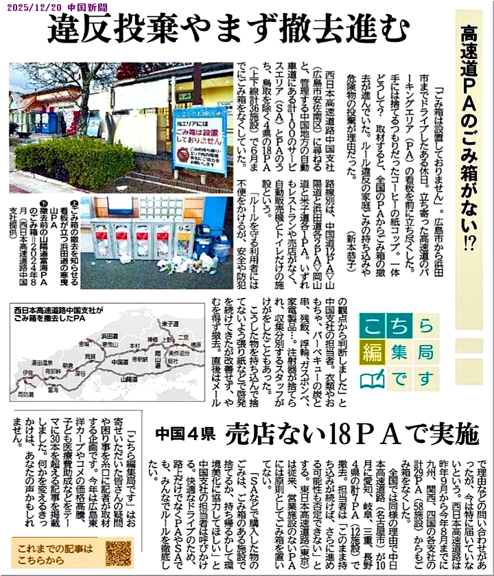 ふ〜ん、昨日(12/20)の中国新聞朝刊で初めて知りましたけど、全国の高速道PAからゴミ箱≠ェ姿を消しますようですねぇ〜
