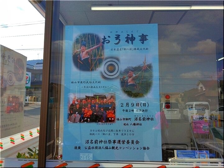 1月の中旬頃でしたか…コンビニに出掛けますと、窓ガラスに「沼名前神社お弓神事=v開催案内のポスターの掲示が(^.-)☆
