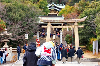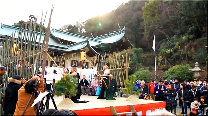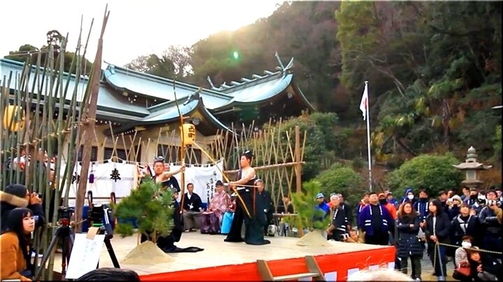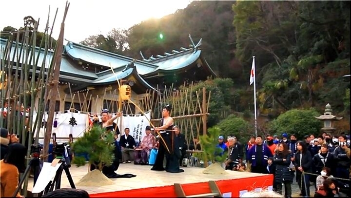 神功皇后が「稜威の高鞆」(いづのたかとも:弓を射る時に使った武具の一種)を納めたのが始まりと伝えられる、神社創建の由来にも関わる神事ですが、その後、年頭に1年の悪鬼を射払ってその年の平穏無事を祈る破魔弓の一種の行事に変化したもの。