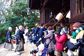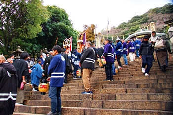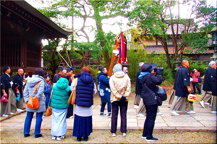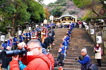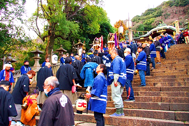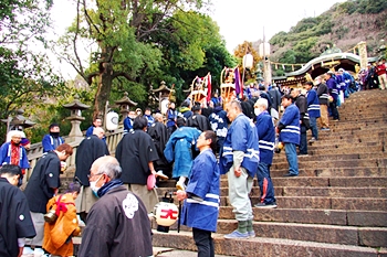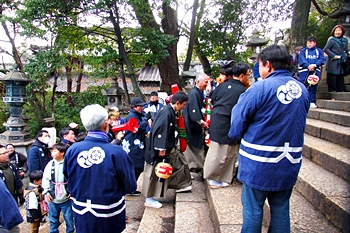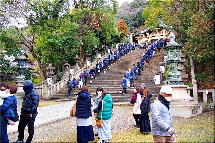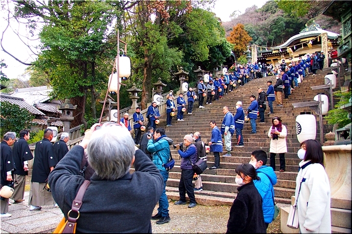 随身門を潜りますと本殿・拝殿まで大雁木(大石段)≠ェ続きますけど、この大雁木では男衆が待ち構えておられます。仲々絵になります光景ですから、カメラ・スマホをお持ちの方は一斉にパチリです(^-^)
