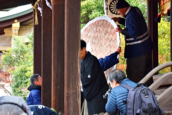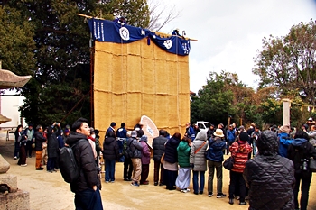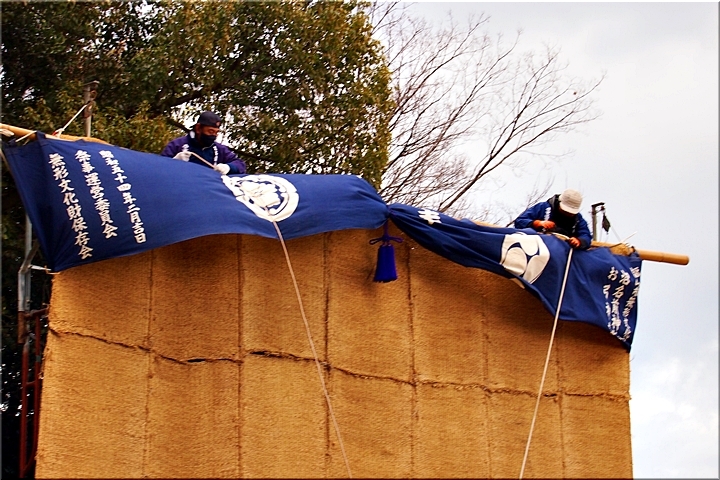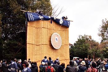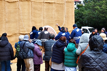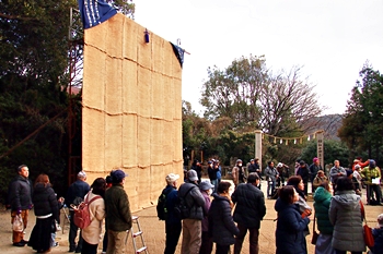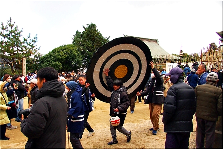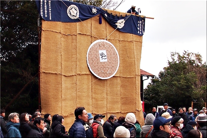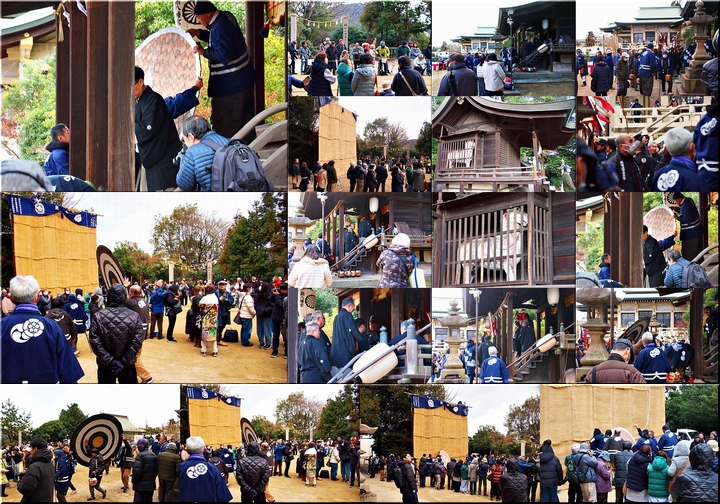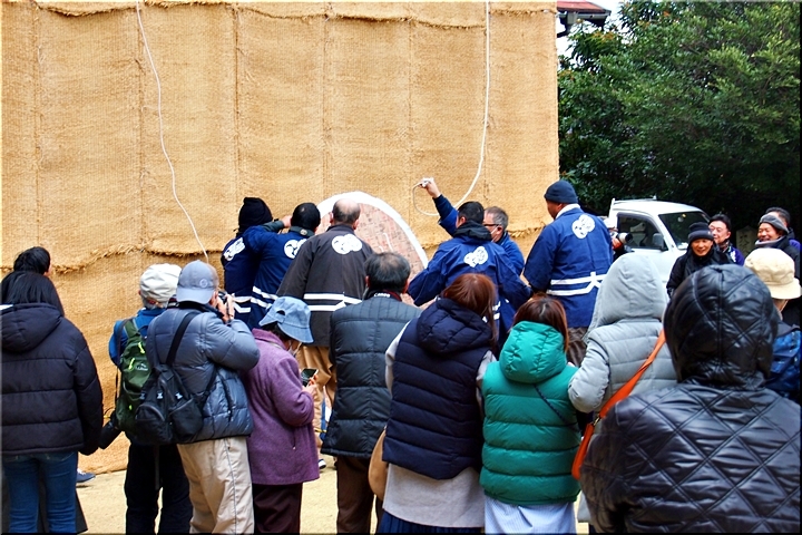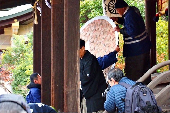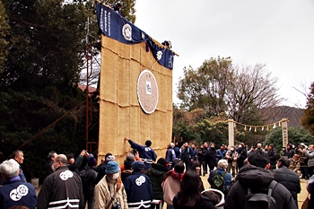 八幡社≠ナの神事が終わりますと、いよいよ、大きな「的」を受け取られ設置です(^.-)☆