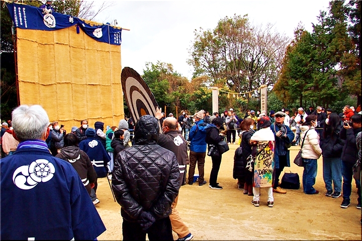 過ぎた一年の悪鬼を祓い、一年の平穏無事を祈る矢は、“甲、乙なし”という意味の文字が墨書された的に向かって放たれます。