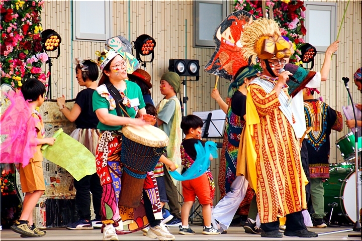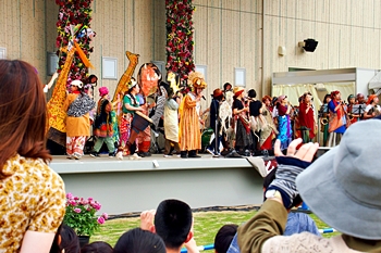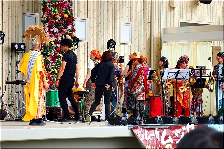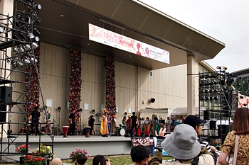 公園東側の芝生広場に向かいますと、ステージ上では、賑やかに歌と演奏が(^.-)☆
