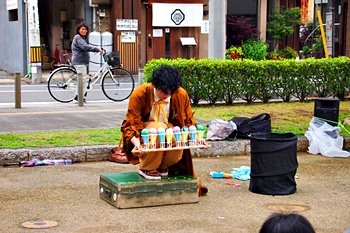 タップダンスやけん玉、ハットジャグリングが得意な細長いクラウン(道化師)。